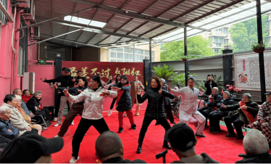 抵达养老院后,师生与老人们围坐一堂,开启温馨互动。活动以学生代表诵读《致爷爷奶奶的一封信》温情开场,字里行间满是对长辈的敬意与祝福;于荣萍、杨莉老师带领老人与师生共练“八段锦”,舒展筋骨的同时传递健康理念。文艺表演环节,预科班学子献上傣族独舞、维吾尔族群舞及冬不拉独奏等民族特色节目,赢得阵阵掌声。支部党员以诗朗诵《我是共产党员》致敬初心,最后全场共唱《我和我的祖国》,老少同频共振,歌声中饱含对祖国的热爱与美好生活的向往。