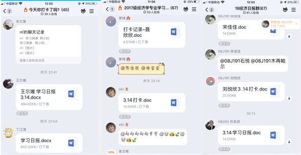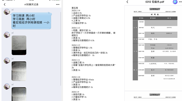 这些制度包括:(1)提出“我跟疫情抢时间”口号,鼓励所有同学在完成正常课程之外,与在校学习相比,每天多挤出三小时学习时间,用于数学、英语、专业课程和人文社会科学的阅读,力争把疫情耽误的学习时间抢回来。(2)全面建立“学习日报”制度。为帮助同学们居家期间保持良好作息和学习习惯,鼓励同学们加入日报打卡群,形成学习互助监督小组,每天晚上向小组成员提交日报,互相监督勉励,把最宝贵的时间都珍惜起来用于学业。(3)开展“最美读书笔记”评选活动。鼓励三个年级同学多阅读、多记笔记,在日报中晒出自己的笔记,并与同学们相约,返校后开展最美读书笔记评选活动。