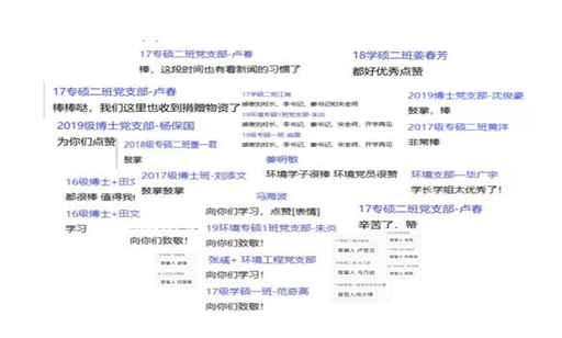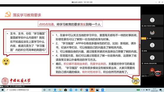 在自由交流环节,2019级博士研究生党支部书记严璐分享了所在支部学习“学习强国”的经历,她认为支部书记日常监督支部党员进行“学习强国”的学习应该增加频率,共同提升支部成员理论学习水平;她介绍了自己的学习习惯,推荐大家每天留出特定的时间段进行学习,养成良好的学习习惯。实验班大学生党支部书记张心阳分享了所在党支部在疫情期间通过视频、文字等各种形式主动关心、科学抗疫,为武汉加油,为疫情防控贡献环境学子力量的经历和感受。