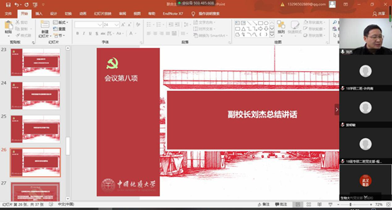 3月28日上午,环境学院全体学生党员通过腾讯会议室以“坚持不懈 坚决打赢疫情防控阻击战”为主题召开线上联合主题党日暨争创学习型党支部交流分享会。副校长刘杰,学院党委书记李素矿、党委副书记姜明敏、学工组全体老师应邀参加会议,党建辅导员宋霖主持会议。